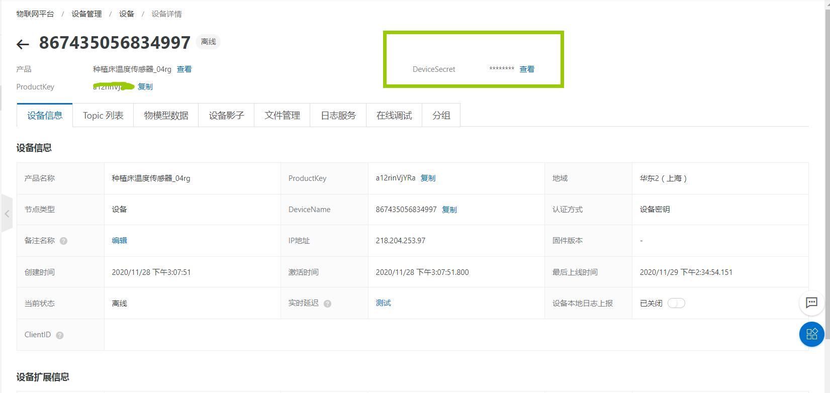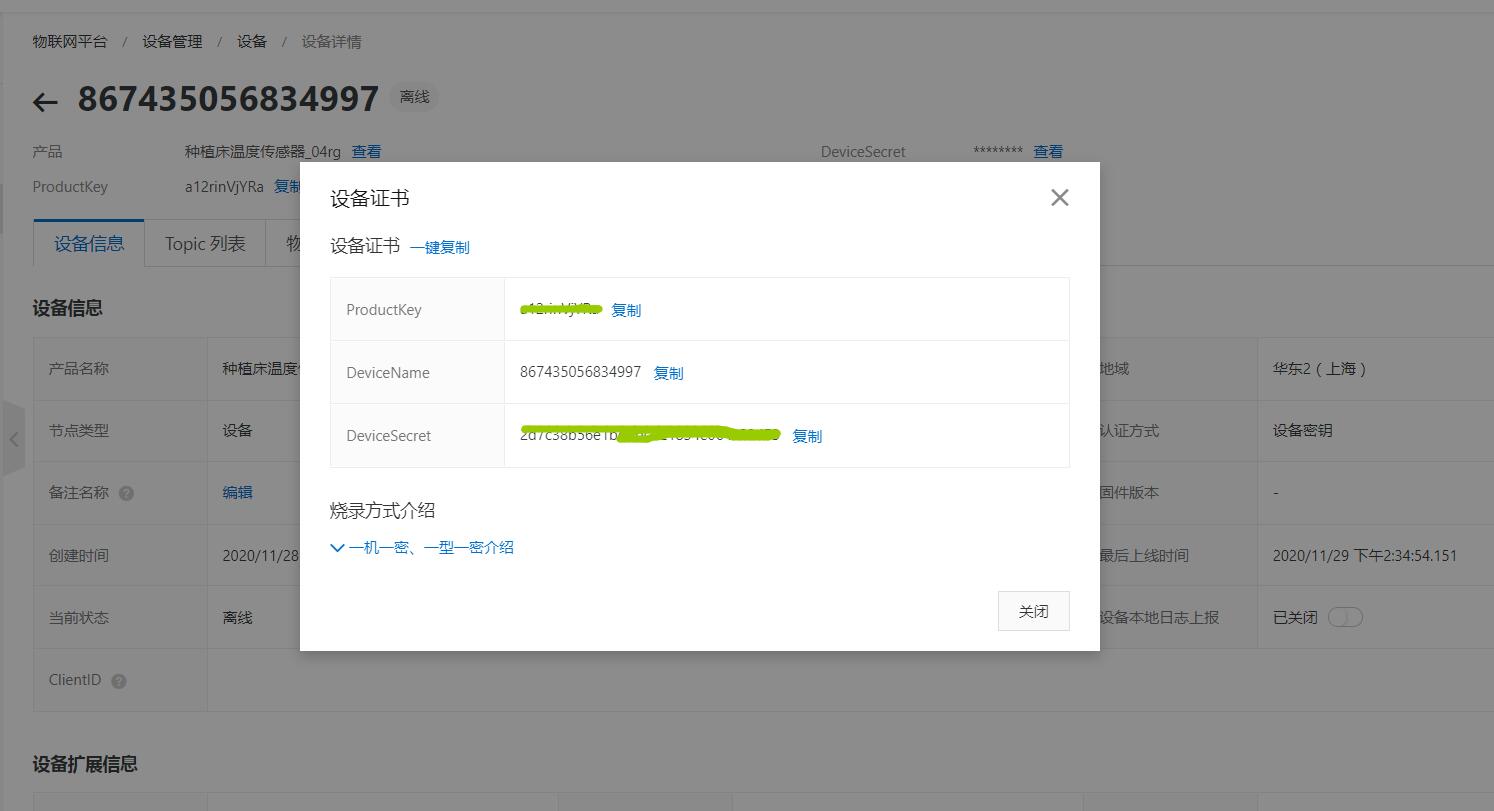 获取方式为点击阿里云物联网后台对应设备详情,点击查看获取